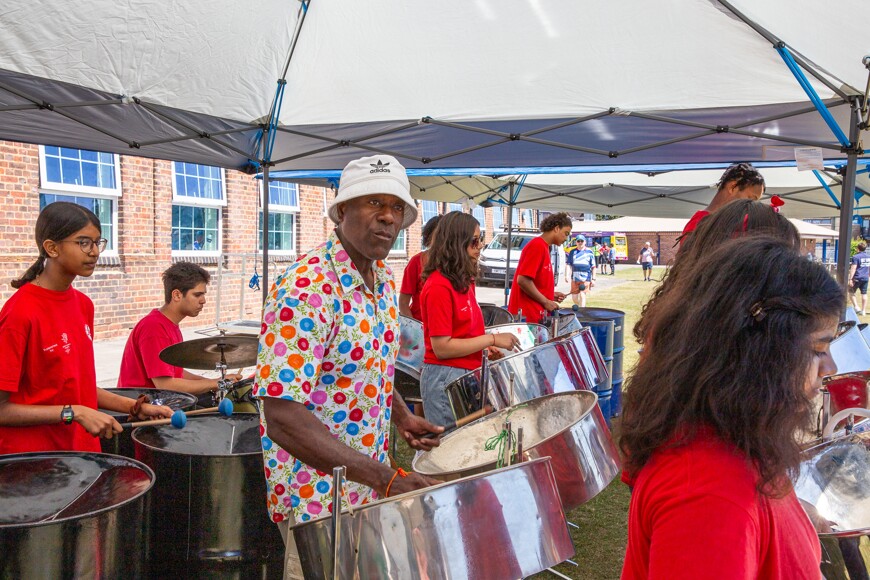 We had two weekends of celebrations, beyond the assemblies that every student received on our history. The first weekend we were lucky enough to have a dinner dance for alumni with an excellent band of former students, The Old Kings. The main event was a weekend in July where students old and new were able to come and either reminisce about their time in school or wonder at our long history. Several hundred people attended and were able to review our extensive archive, perhaps to find pictures of themselves, entertained via music from KAOS, the (old) school choir and jazz from Dave Green, all supplemented by our own current students who played fantastic sets both Saturday and Sunday. There was even an Old Kingsburian cricket match.